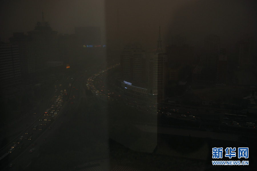 2015年4月15日17時許,北京遭遇沙塵暴襲擊,城區能見度降低。圖為北京西便門橋附近場景。新華網 李清攝