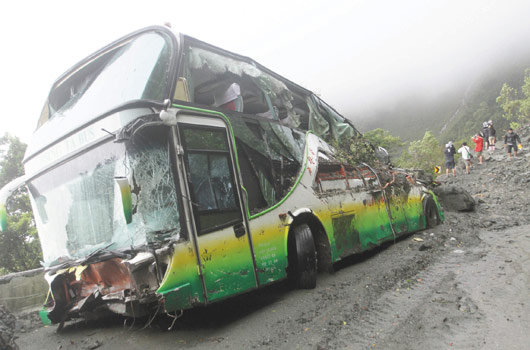 蘇花公路112.8公里處一輛被砂石擊中的游覽車23日被挖出后,車體支離破碎,顯示沖擊力道之大。來源:臺灣《聯合報》