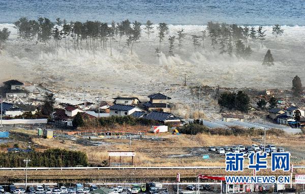 2011年3月11日,在日本名取市,強烈地震引發的海嘯襲擊一處居民區。3月11日當地時間14時46分(北京時間13時46分),日本發生里氏8.8級地震并在日本東北太平洋沿岸引發巨大海嘯,造成重大人員傷亡。高達數米的海浪將車輛等卷入海中,并沖毀沿岸建筑。新華社發