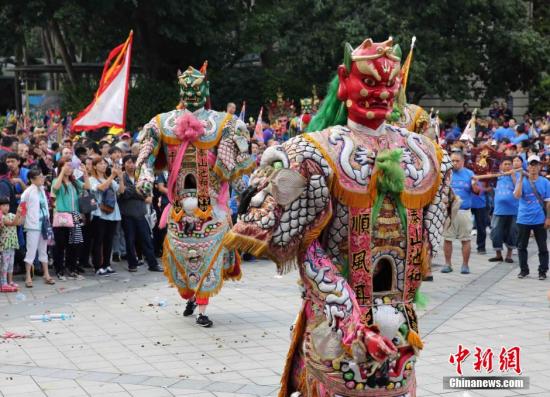 10月25日,多個民間團體在臺北中山堂、凱達格蘭大道等地舉辦慶祝臺灣光復70周年活動。其中,中華統一促進黨在中山堂廣場祭祀兩岸抗日烈士英靈,祈愿兩岸和平團圓,并結合各地民間信仰團體在傳統老城區舉辦巡游活動。中新社記者 任海霞 攝