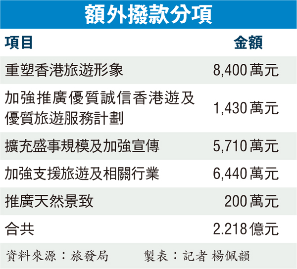 他又指,旅發局于2016至17年度獲特區政府額外撥款2.218億元,加上3.33億元的常規撥款作市場推廣。他表示,額外撥款當中9,830萬元會用作重塑旅游形象及加強宣傳優質誠信旅游,如利用“My Time for Hong Kong”平臺推出新宣傳片,于各地電視臺、數碼媒體、區域及全球電視臺播出,包括YouTube、Discovery Channel、BBC及CNN等,并會在騰訊、百度、支付寶等內地主要社交平臺,加強推廣以刺激各地旅客訪港及消費意欲。