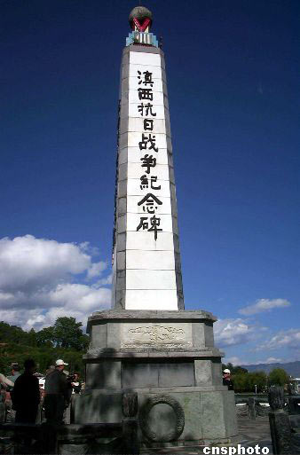 資料圖:2002年,云南隆重紀(jì)念滇西抗戰(zhàn)暨赴緬對(duì)日作戰(zhàn)60周年,與會(huì)者在瞻仰滇西抗戰(zhàn)紀(jì)念碑。 中新社發(fā) 納家驊