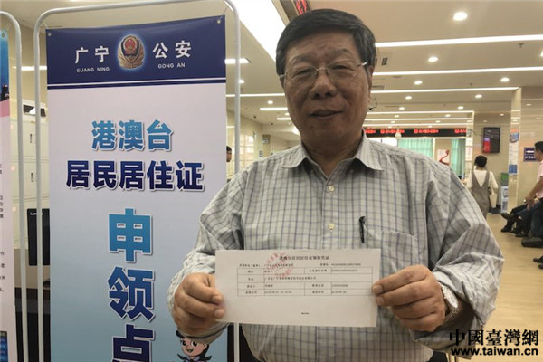 中國臺灣網(wǎng)9月6日肇慶訊 9月1日上午,廣東省肇慶市臺商協(xié)會會長林谷豐帶領(lǐng)11名臺灣同胞來到肇慶市廣寧縣行政服務(wù)中心,在通過簡單的填表、錄制指紋后,就拿到了居住證領(lǐng)取憑證。“有了居住證之后,解決了我們外出搭乘高鐵不能自助取票的問題,在經(jīng)商投資方面也更方便,我會動員我們臺商協(xié)會的成員來申領(lǐng)這個居住證。”林谷豐還說,“居住證的發(fā)放,是一項十分便民的措施,是落實惠臺31條和踐行“兩岸一家親”理念的具體體現(xiàn)。”