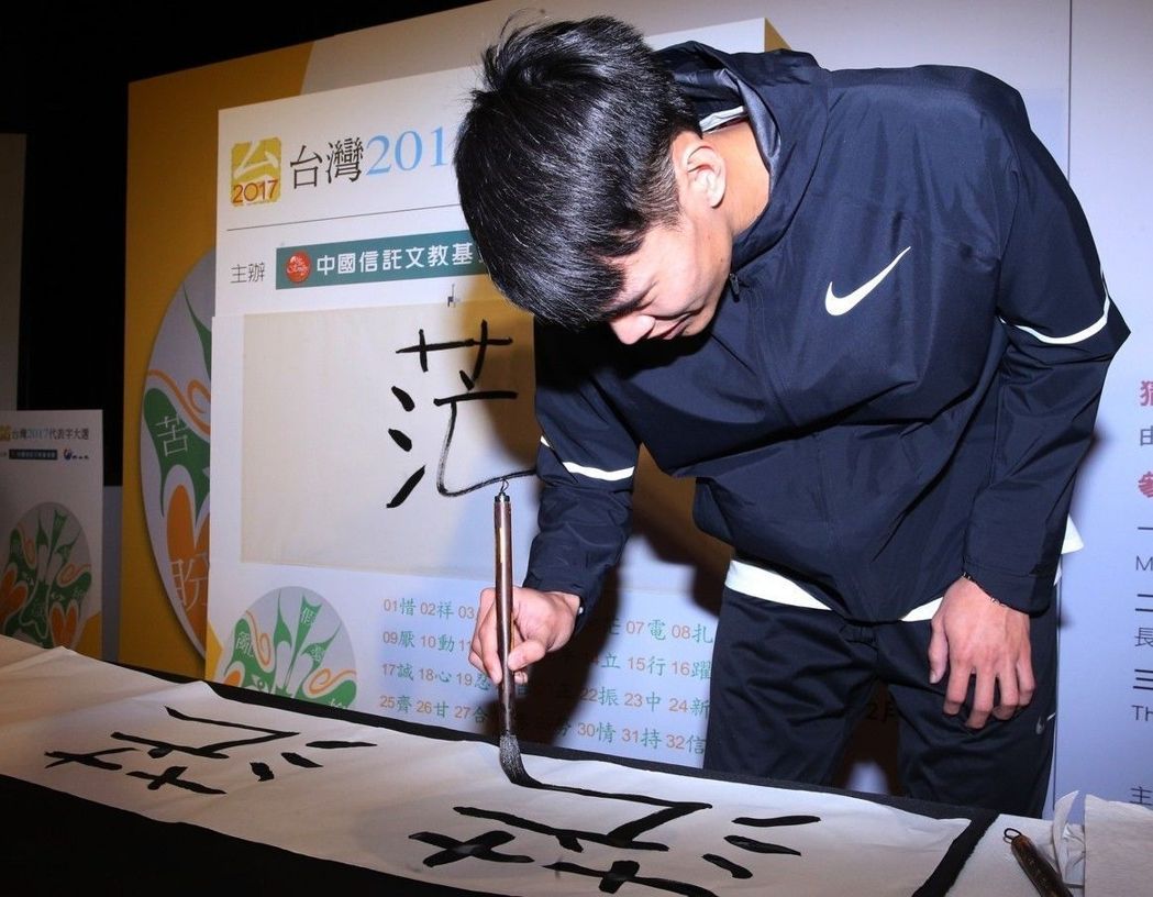 陳奎儒用毛筆寫下臺灣2017代表字“茫”。(圖片來源:臺灣《聯合報》)