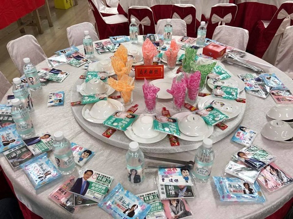 網友在臉書《爆廢公社》中po文表示,前往餐廳吃“辦桌”的時候,菜都還沒上,就看見餐桌上放滿高雄市議員的競選文宣品,每一個顧客都可以拿到5包面紙、1包濕紙巾和1罐瓶裝水,因為數量太多又想避免互相遮擋,有些甚至必須放在餐具上面,原po看見此景忍不住調侃,“可以告訴我這一桌是來吃什么的嗎?”