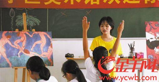 “我們的課堂采取1+4的模式,就是由一名藝術專業的大學生志愿者為主講,另外4名大學生志愿者為助教,共同完成教給孩子們的課程。大學生志愿者需要充分發揮主觀能動性,可以找一些他們喜愛的藝術作品作為切入點,通過一些孩子們喜歡的形式,引導孩子們去欣賞和發現。”余穎洲說,曾經有一節課為了分享外國畫家馬蒂斯的作品,大學生志愿者將整個教室布置成一個美術館,通過4節課,層層深入、循序漸進地引導孩子們欣賞馬蒂斯的作品、剖析馬蒂斯,最后由孩子們自己去創作作品,放在畫框里,在課堂“美術館”里進行展示。其中,課件的設計、制作、呈現等,都是由大學志愿者們獨立完成。