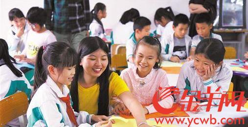 大學生志愿者在指導科韻路學校的孩子做撕紙作品。