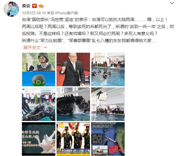 對此,向來關(guān)注兩岸動態(tài)的黃安在微博上發(fā)表看法,他寫道,兩周以后,等到該死的兵都死光了,所謂的“戰(zhàn)到一兵一卒”之后,然后投降。不是這樣嗎?還有戲唱嗎?那又何必打兩周?多死人有意義嗎?