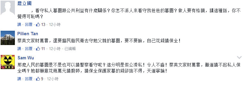 其實不用嘉賓特別說明,是個有常識的人都知道,警察哪能天天“守墓”啊?但不知道為什么,蔡英文上任之后,不光蔡英文自己覺得這件事兒稀松平常,連蔡當(dāng)局的官員也跟著起哄,還要生編出一個警察守墓是為公共利益的名頭。戲是好戲,就是有點過啊綠營的老鐵們!