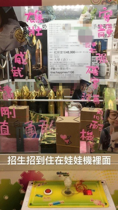 除此之外,又有網友發現,有官兵將1年期志愿役軍官招募放到夾娃娃機里,娃娃機里就有招募信息,還有負責女士官的軍裝照與Facebook、line聯絡方式。網友拜服,有人說好想把照片夾出來,另有人感嘆,基層作招募招到住在娃娃機里面,“真是放大絕”。