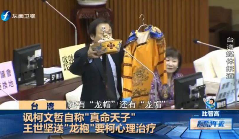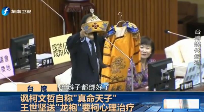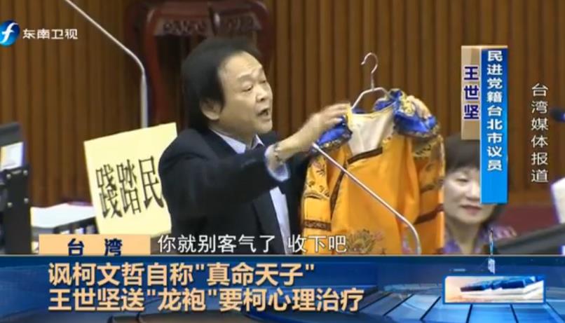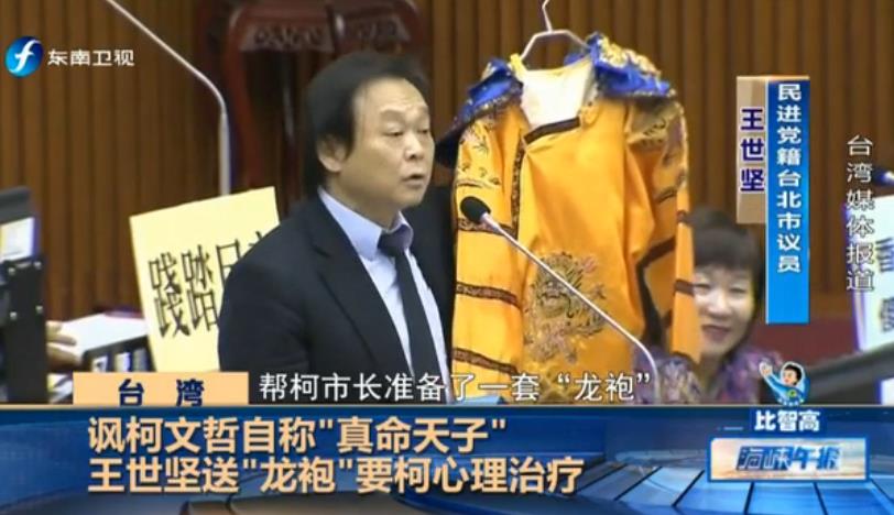 王世堅與柯文哲互懟早不止一兩次,情緒激動的王世堅也是不斷鬧出笑話。據東南衛視報道,柯文哲10日赴議會施政報告,王世堅拿出“龍袍”“龍帽”,說要送給自稱“真命天子”的柯文哲,引起全場哄堂大笑。王世堅說:“幫柯市長準備了一套‘龍袍’,讓柯市長私下在辦公室或在家里可以穿上它過過癮,這也算是一種心理治療”。他還勸說柯文哲,“送給自稱‘真命天子’的你,你就別客氣了,收下吧!