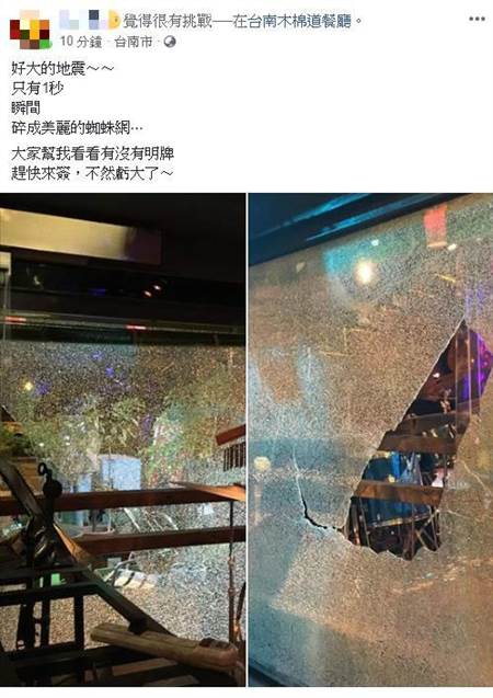 報道說,地震發生后,網友們在臉書《爆料公社》紛紛留言,“先上下,再來左右晃得超夸張,貓咪全炸毛!”“臺南東區碰碰兩聲……立馬從床上彈起來往樓下沖”“永康真的不夸張啦,直接蹦一聲超大力”“淺層地震,兒子說震央就在他腳下……”甚至在臺南木棉道的餐廳,地震那一秒,就讓玻璃瞬間碎成蜘蛛網。據臉書上永康人的說明,這次地震是比起以前的更恐怖,是瞬間地上下快速震!“剛剛真的好恐怖!第一下震完過不到一秒又震,覺得公寓被挖起來抖一下”。