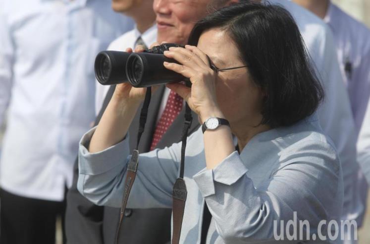 蔡英文到苗栗縣用望遠(yuǎn)鏡眺望,視察離岸風(fēng)力發(fā)電機(jī)。(圖片來(lái)源:臺(tái)灣《聯(lián)合報(bào)》)