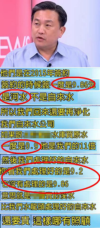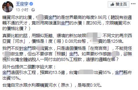 按王定宇的說法,大陸賣給金門的河水,1噸是9.86元(新臺幣,下同),但臺灣的自來水售價1噸9.2元。他質疑大陸,明明就是“在商言商”的做生意,卻還敢說是“在照顧金門人”!