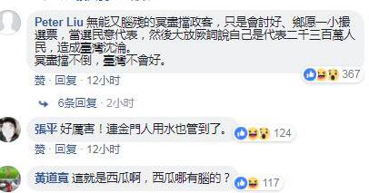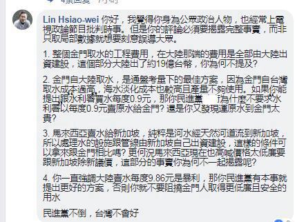 臉譜網“靠北金門”社團就有網友貼出相關新聞后痛罵王定宇“光講干話”!其表示金門縣政府也曾評估過從高雄送水,1噸成本約280元,若從福建引水到金門,1噸水的成本大約45.5元;但根據協議,大陸1噸水僅賣臺灣9.86元,所以“您是要送水給金門人用嗎?光講干話!”