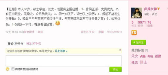 啟事說:“本人38歲,碩士學位,處女。現面向全國征婚:1、作風正派、黨員優先;2、有正當職業、無婚史、公務員優先;3、四十歲以下、碩士以上學歷;4、婚前不能發生性接觸;5、婚后三年考察期不能過性生活、考察期結束后方可行夫妻之事;6、處男優先。1-5條缺一不可,有意者請留言。”