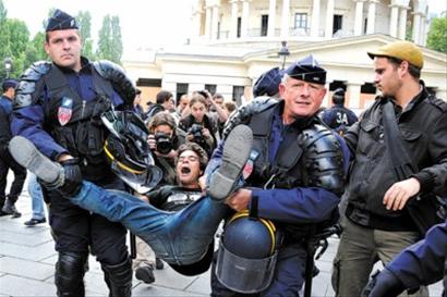 5月26日,法國(guó)巴黎,G8峰會(huì)抗議者被警方抬走。