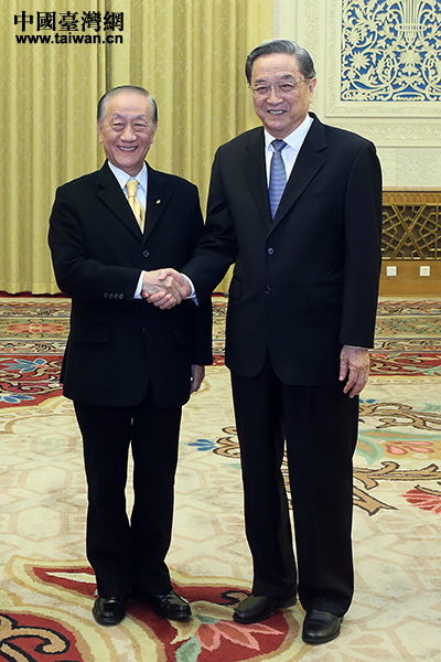 12月11日,全國政協主席俞正聲在北京人民大會堂會見新黨主席郁慕明率領的新黨大陸訪問團。(中國臺灣網 于斯文 攝)