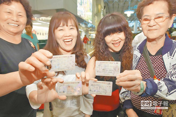 新版卡式臺胞證在21日全面啟用。圖為臺灣旅客21日前往大陸旅游,秀出新版卡式臺胞證。(圖片來源:臺灣《中時電子報》)