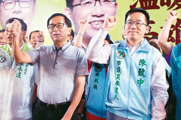陳水扁日前參加兒子陳致中高市議員黨內(nèi)初選造勢晚會,因上臺送好彩頭,被中監(jiān)認(rèn)定違反“不上臺”規(guī)定。(圖片來源:臺灣《聯(lián)合報》)