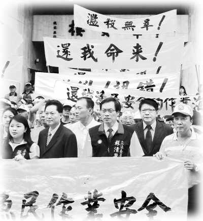臺灣漁會13日組織抗議活動表達漁民之怒,從各地抵達臺北的近400位漁民頭綁“抗議”布條,打出“還我命來”、“流氓行為”、“濫殺無辜”的標語。被射殺的漁民洪石成所在的屏東縣琉球鄉鄉長和30多名鄉親走在抗議人群中,代替正在料理后事不能北上的洪石成的家屬聲討菲律賓公務船的暴行。