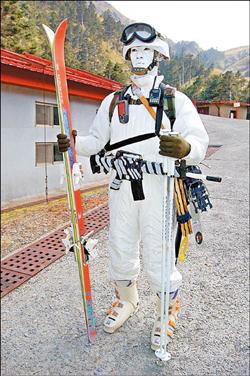 特戰士官兵在位于合歡山的武嶺寒訓中心訓練雪地轉向,穿上了雪屐后連普通轉向都變得復雜,圖中動作是用于向后轉,姿勢頗富趣味。