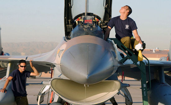資料圖:以色列空軍地勤人員正在檢查一架F-16戰斗機。