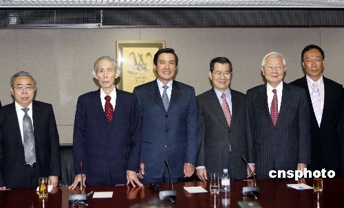 4月7日,馬英九與蕭萬長傍晚拜會臺塑集團創(chuàng)辦人王永慶(左二),就外界矚目聚焦的兩岸三通、大陸投資松綁等議題進行交談。這是馬英九選后“請益之旅”首度公開拜會企業(yè)界。 中新社發(fā) 杜洋 攝