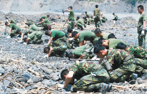 六龜新發村新開部落31人被活埋,臺軍為尋找罹難者遺體,連鼻子都用上了,為防止疏漏,士兵排成一列趴在土石上一寸寸地聞,遇有異味再開挖,令人感動。圖片來源:臺灣《聯合報》