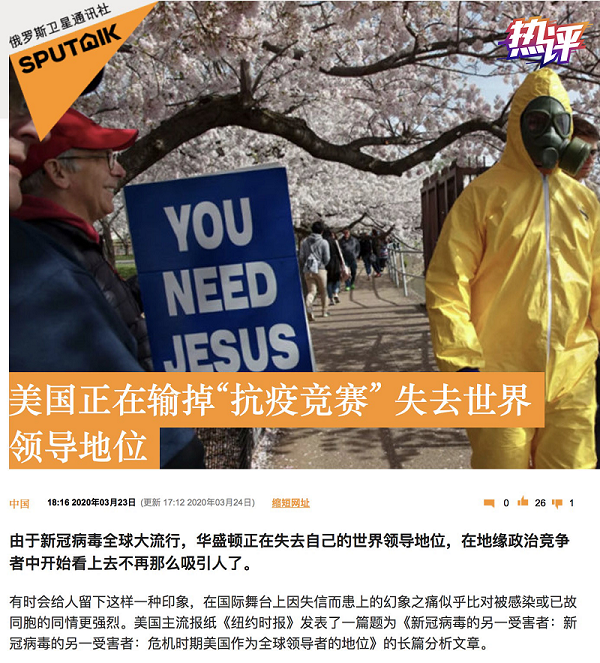 俄羅斯媒體23日評論稱,美國正在輸掉抗病毒競賽,失去世界領導地位;美國《紐約時報》同一日的報道也認為“美國正在進一步后退,放棄自己長期以來的角色”。