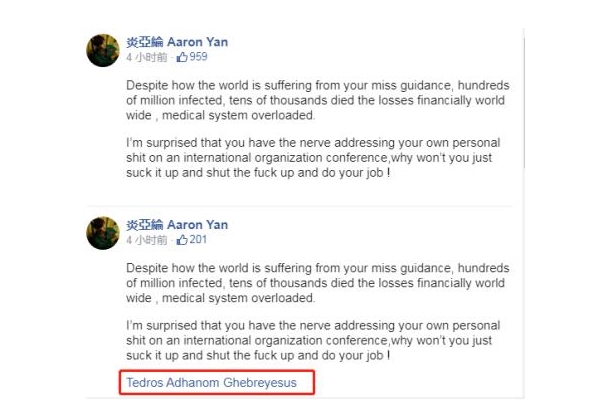 此外,臺(tái)灣知名藝人炎亞綸竟然也加入了對(duì)譚德塞的斥責(zé)。9日中午,炎亞綸在其臉書以英文指責(zé)譚德塞“誤導(dǎo)”世界,還指責(zé)稱“你竟然有勇氣在一次國際組織會(huì)議上發(fā)表你自己個(gè)人的屎一樣的言論”,“你為什么不干脆閉嘴、閉上你的臭嘴,做好自己的工作!”同時(shí)附上了譚德塞臉書的鏈接,隨后他又對(duì)貼文進(jìn)行編輯,去掉了此鏈接。