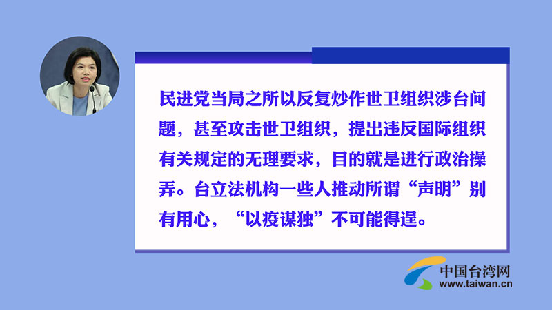 絞盡腦汁想在國際舞臺(tái)秀“存在感”的民進(jìn)黨當(dāng)局,每逢世界衛(wèi)生大會(huì)就開始演戲,這次疫情期間也不例外。民進(jìn)黨當(dāng)局立法機(jī)構(gòu)曾與2月21日通過所謂“共同聲明”,提出讓世衛(wèi)組織“以完整無礙的制度化方式接納臺(tái)灣參與WHO的運(yùn)作”的無理要求。對(duì)此國臺(tái)辦發(fā)言人朱鳳蓮作出回應(yīng):民進(jìn)黨當(dāng)局之所以反復(fù)炒作世衛(wèi)組織涉臺(tái)問題,甚至攻擊世衛(wèi)組織,提出違反國際組織有關(guān)規(guī)定的無理要求,目的就是進(jìn)行政治操弄。臺(tái)立法機(jī)構(gòu)一些人推動(dòng)所謂“聲明”別有用心,“以疫謀獨(dú)”不可能得逞。