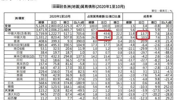 此前,國臺辦發言人朱鳳蓮就曾針對相關話題回答過記者提問。她表示,(誰依賴誰?)數字會說話。(具體數據如下,嫌麻煩的可以直接看結論。據海關總署統計,今年1至11月兩岸進出口貿易總額是2356.9億美元,占大陸進出口貿易額的5.4%,其中大陸從臺灣進口1817.1億美元,占同期大陸進口總額的9.8%。臺灣從大陸獲得的貿易順差是1277.3億美元。大陸從臺灣進口1817.1億美元,占比9.8%,臺灣方面統計的數字,向大陸出口占出口總額的43.8%。)大陸是臺灣最大出口市場、最大貿易順差來源地,這是事實。如果沒有大陸,臺灣對外貿易將出現巨額貿易逆差,今年經濟將難以維持正增長。