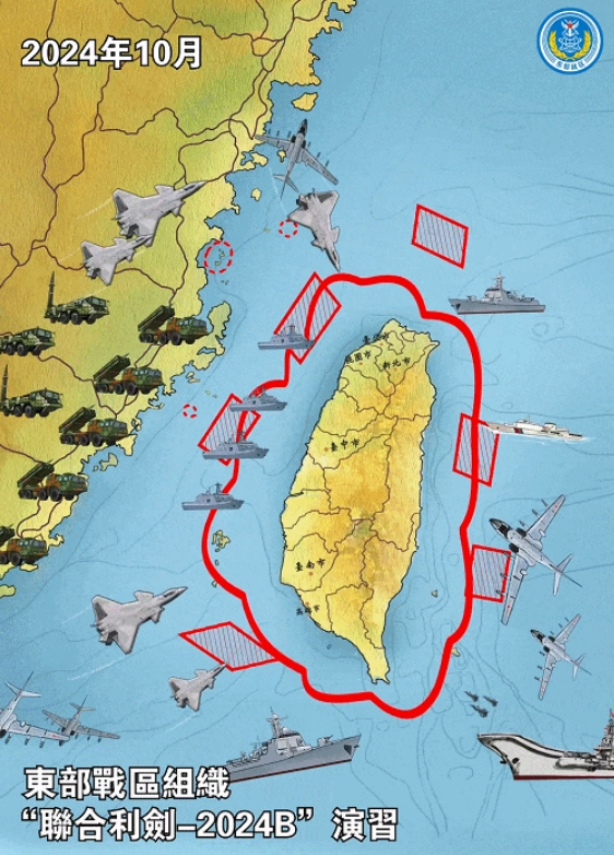 10月14日凌晨,解放軍東部戰區發布開展“聯合利劍-2024B”演習公告。當許多人還處于睡夢之中,解放軍陸軍、海軍、空軍、火箭軍等兵力,已經位臺灣海峽、臺島北部、臺島南部、臺島以東等區位開始行動了。