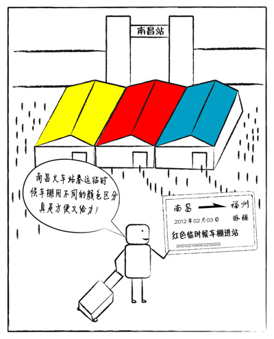 臨時(shí)侯車棚有黃、紅、藍(lán)三種顏色,而旅客買到不同車次的車票,下面都印有在哪種顏色的車棚底下侯車。南昌火車站一個(gè)小動(dòng)作,減少了旅客到處打聽(tīng)侯車地點(diǎn)的麻煩,帶來(lái)了溫暖和溫馨。(2月2日中廣網(wǎng))