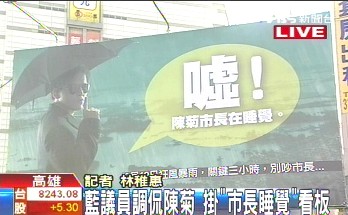 據臺灣《聯合報》報道,“噓!陳菊市長在睡覺!辟即笈_北車站大廳設置廣告,讓“睡菊”風波延燒到臺灣北部。據透露,這是藍營最新的催票文宣,希望高雄人返鄉投票。