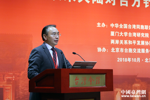 兩岸關(guān)系和平發(fā)展協(xié)同創(chuàng)新中心主任、廈門(mén)大學(xué)臺(tái)灣研究院教授劉國(guó)深在研討會(huì)上發(fā)言。(中國(guó)臺(tái)灣網(wǎng) 張潔 攝)