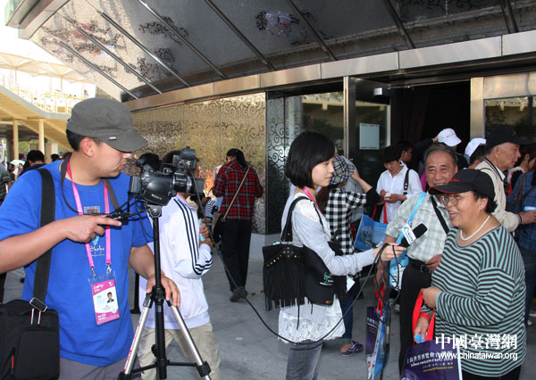 中國(guó)臺(tái)灣網(wǎng)記者在采訪參觀臺(tái)灣館的游客。(中國(guó)臺(tái)灣網(wǎng) 鐘寶華 攝)