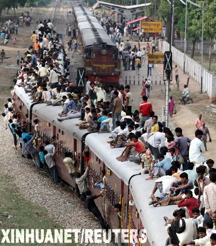 7月11日,在印度北方邦中部城市勒克瑙,當地人乘坐一列火車出行。當天是“世界人口日”。 新華社/路透