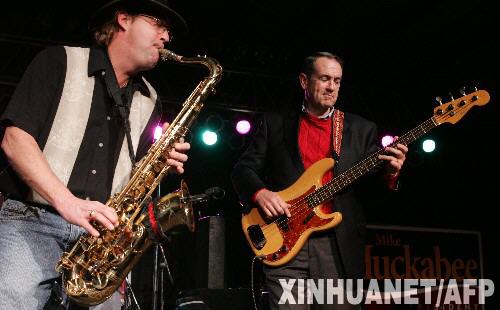 1月1日,在美國艾奧瓦州的得梅因,美國共和黨總統競選人邁克·赫卡比(右)在競選集會上表演。美國總統選舉黨內初選即將于1月3日在艾奧瓦州開鑼,民主黨和共和黨將分別舉行基層黨員會議,推舉參加高級黨員會議的代表,以選擇本黨總統候選人。 新華社/法新