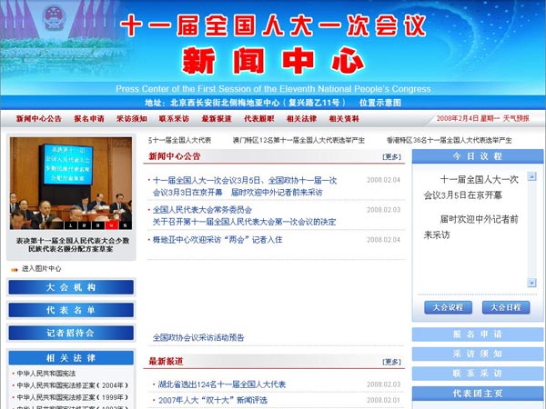 為方便記者采訪,兩個會議新聞中心分別開設網頁,及時通過互聯網發布采訪信息及與采訪相關的資訊。其中,十一屆全國人大一次會議新聞中心網頁地址為:www.npc.gov.cn,全國政協十一屆一次會議新聞中心網頁地址為:www.cppcc.gov.cn。兩個網頁已于4日同時開通。