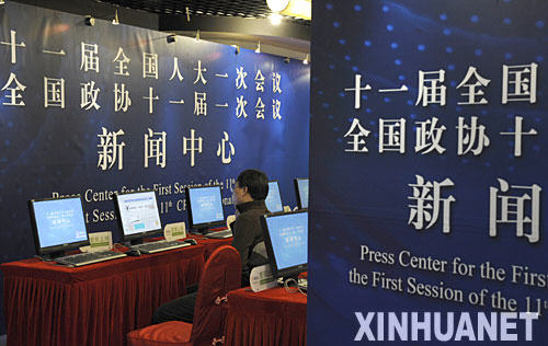 2月27日,新聞中心提供寬帶上網(wǎng)服務(wù)。 十一屆全國人大一次會議和全國政協(xié)十一屆一次會議將分別于3月5日和3月3日在北京開幕。記者獲悉,設(shè)在北京西長安街北側(cè)梅地亞中心的兩會新聞中心已于26日正式啟動(dòng),中心工作人員開始接待和安排中外記者采訪會議。 新華社記者 戴旭明攝
