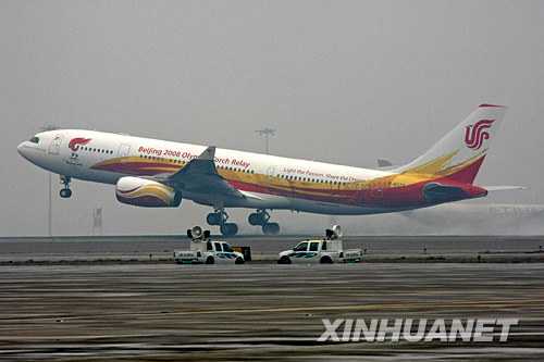 4月1日,“奧運圣火號”飛機起飛。當日,北京奧運圣火搭乘專機離京,正式踏上以“點燃激情、傳遞夢想”為口號的全球傳遞之旅。新華社發(魏萌攝)