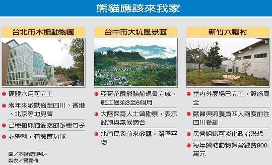 新竹縣:新竹縣六福村主題樂園公關部經理袁相杰表示,斥資1億元(新臺幣 下同)的六福村“熊貓館”,去年9月就已經竣工,而負責照料熊貓的4名專業人員,也已訓練完畢,隨時都可以接熊貓來新竹。而熊貓館全天侯室內攝氏20度的恒溫舒適條件,條件不比臺北市動物園差,最重要的是臺灣民眾未來到六福村看貓熊,只要60元就能達成愿望,尤其對帶動地方的觀光推展有極大的幫助。目前已有多位新竹縣的政治人物強調,將親自向馬英九陣營救表達爭取熊貓的意愿。《全文》