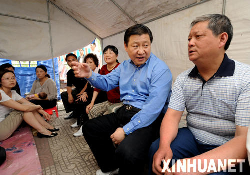 新華網西安5月20日電 中共中央政治局常委、中央書記處書記、國家副主席習近平在陜西省委書記趙樂際、省長袁純清等陪同下,今天繼續在陜西地震災區察看災情,慰問干部群眾,指導抗震救災工作。他強調,各級領導干部要始終堅持以人為本,切實把群眾利益放在第一位,滿腔熱情地幫助受災群眾排憂解難,妥善安排好他們的生產生活。