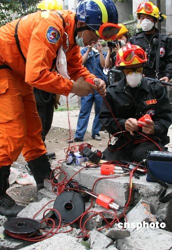 來自臺灣的紅十字救援隊,十七日進入四川綿竹市漢旺鎮展開搜救工作,圖為救援隊在現場調試裝備。 中新社發 齊彬 攝