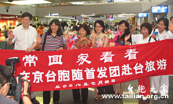 北京市臺聯副會長葉芳、鄭大等人專門到機場為她們送行。當大家拉開寫有“常回家看看—歡送在京臺胞隨首發團赴臺旅游”的橫幅合影留念時,立刻引來了眾多在場的記者和游客們的鏡頭和關注。