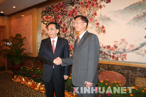 7月12日,應中共廣州市委書記朱小丹邀請,中國國民黨高雄市委員會廣州訪問團搭乘高雄至廣州周末包機抵達廣州訪問。這是中共廣州市委書記朱小丹(左)與中國國民黨高雄市委員會主委許福明親切握手。 新華社發(閆潔 攝)