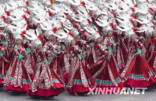 8月8日,演員們在開幕式前表演“苗族踩鼓”。當日,第29屆奧運會開幕式將在國家體育場——“鳥巢”舉行。 新華社記者 邢廣利 攝