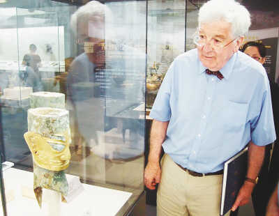 在“競技——古代奧林匹克文物展”展廳,記者偶遇英國著名雕塑家、北京奧林匹克公園奧運雕塑“從雅典到北京”的設計者司徒安,他是聽說首都博物館有三星堆和紅山遺址文物展覽,特地趕來參觀的。他表示,北京奧運會賽場內外洋溢著中國文化。